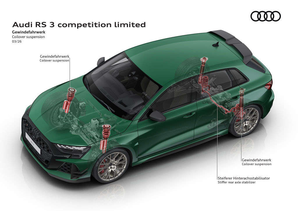 Väčšiu stabilitu zadnej časti vozidla zabezpečuje nový rúrkový stabilizátor zadnej nápravy s hrubšími stenami. S torznou pevnosťou 85 N/mm (Newton/milimeter) je tvrdší ako sériový model. Okrem toho je aj tuhosť pružín vzadu s 80 N/mm väčšia ako pri sériovej verzii. Vďaka tomu pri akcelerácii z rýchlych zákrut RS 3 competitionlimited poskytuje perfektnú kombináciu ovládateľnosti, bezpečnosti a agility.