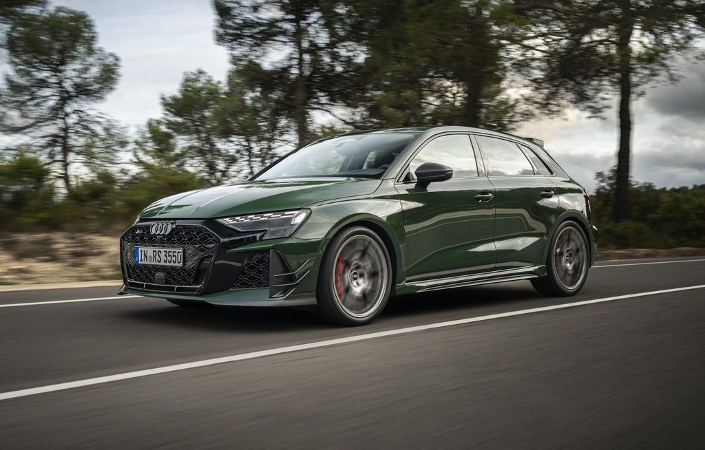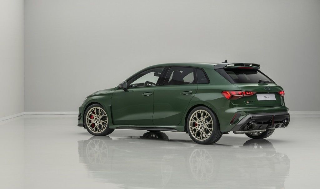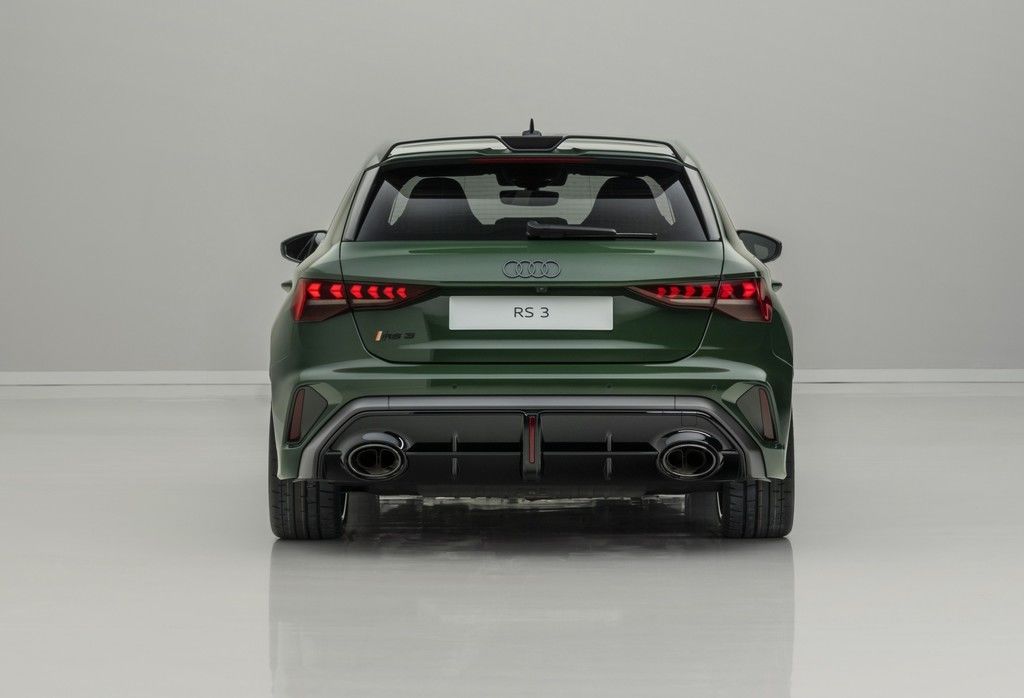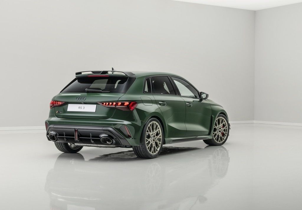 Okrem toho sa dá špeciálnaedícia rozoznať aj podľa stmavených adaptívnych svetlometov Matrix LED, ktorých denné svetlá pri odomknutí a zamknutí vozidla rozsvecujú LED segmenty v poradí zapaľovania päťvalcového motora 1-2-4-5-3. K dispozícii sú tri farby karosérie: okrem obľúbeného sivého odtieňa Daytonagrey a nového matného bieleho odtieňa Glacierwhite je to aj nápadná farba Malachite green. Touto ikonickou farbou RS 3 competition limited pripomína model Audi Sport quattro, ktorý položil základy pre slávne časy v automobilových súťažiach s legendárnym päťvalcovým motorom.