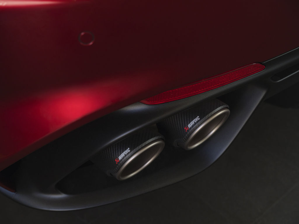 Giulia má navyše aktívnu aerodynamiku s nastaviteľným karbónovým predným spojlerom (splitterom), usmerňujúcim prúdenie vzduchu pod vozidlom pre zvýšenie stability a zlepšenie jazdných vlastností. Nezameniteľnú zvukovú kulisu dodáva špičkovým modelom výfuková sústava Akrapovič z ľahkého titánového plechu, pôsobivým spôsobom transformujúca energiu výfukových plynov na akustický zážitok, posilňujúci väzbu medzi automobilom a vodičom.
