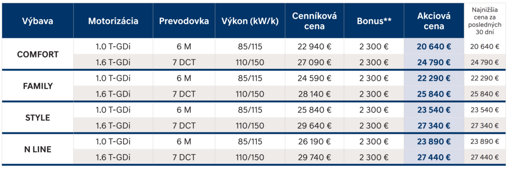 Hyundai i30 MY26 vo verzii hatchback štartuje na akciovej cene 19 640 € s motorizáciou 1,0 T-GDi, resp. 23 790 € s výkonnejším motorom 1,6 T-GDi a automatickou prevodovkou DCT.