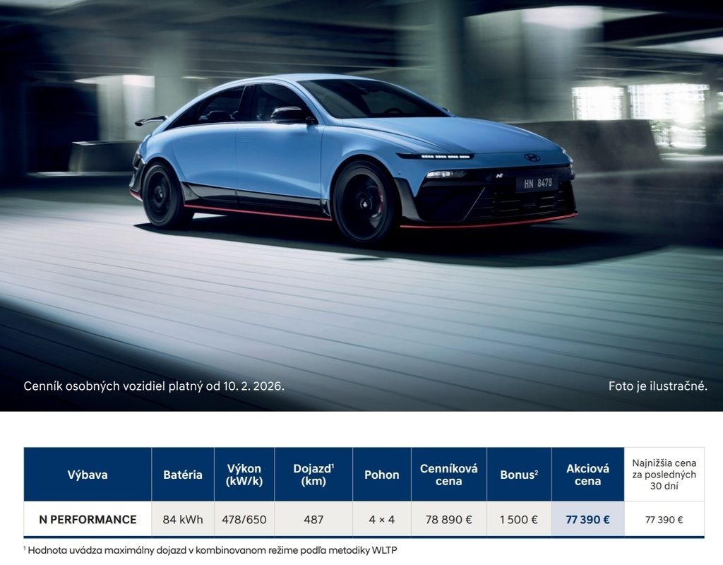 Cenníková cena modelu Hyundai IONIQ 6 N s akciovým bonusom je stanovená na 77 390 €. V tejto sume zákazník získava kompletnú výbavu vrátane pohonu 4x4, pokročilých asistenčných systémov, adaptívneho podvozka a špičkových digitálnych technológií. Za príplatok je k dispozícii panoramatické strešné okno v hodnote 1 200 € a balík TechnoPack s digitálnymi vonkajšími spätnými zrkadlami za 1 300 €. Výrobca zároveň poskytuje na vozidlo záruku 5 rokov bez obmedzenia kilometrov a 8 rokov alebo 160 000 kilometrov na vysokonapäťovú batériu.