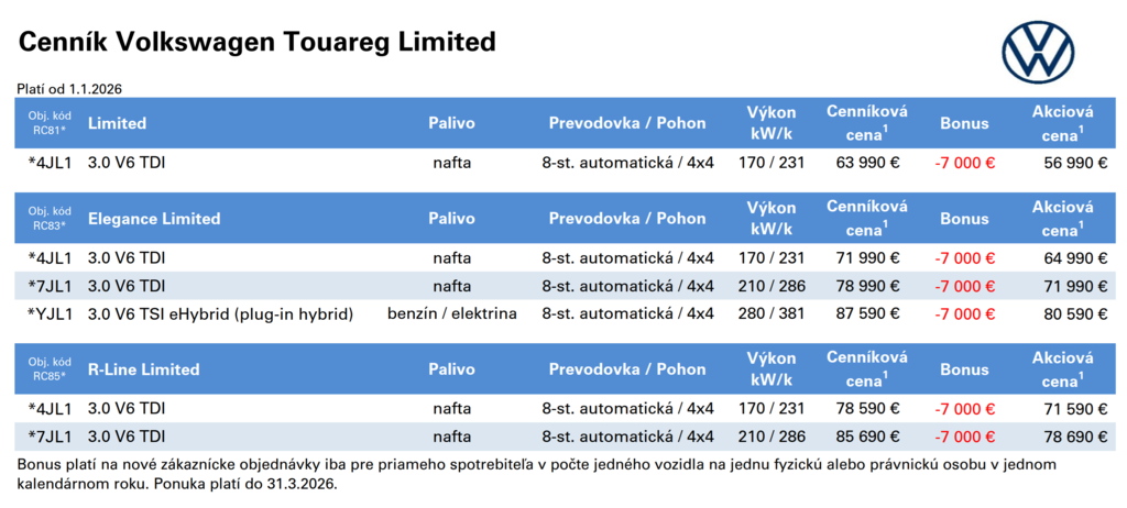 Kompletný cenník nájdete tu: Touareg LIMITED 2026 CENNÍK