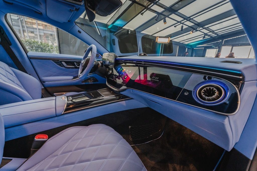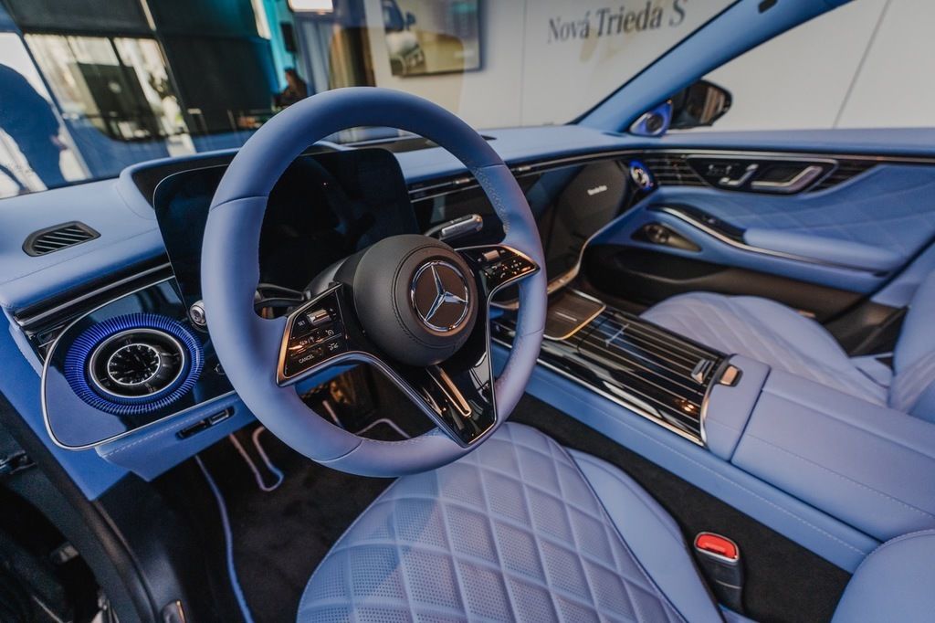 Palubovka je jeden veľký hyperscreen, sú tam po celej šírke už iba samé displeje. Čo sa týka jazdných vlastností, auto bude štandardne jazdiť na vzduchovom podvozku airmatic, priplatiť si môžete active body control, teda kontroly náklonov karosérie nad každým kolesom a samozrejme aj natáčanie zadných kolies do 10°uhla.
